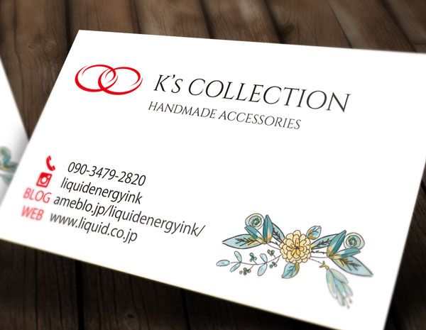 シンプルなロゴと手書きの花のイラストの組み合わせがおしゃれなアクセサリー・雑貨店名刺またはショップカードデザイン。