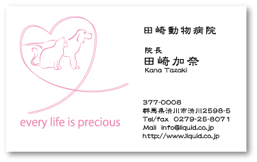 | 動物病院名刺。ピンクハートの中に犬と猫のイラスト。その下に"every life is precious"(すべての命は尊い)のキャッチコピー。シンプルで実用的な名刺デザイン。動物の命を大切にする気持ちを伝える動物病院名刺デザイン。動物病院の先生、いかがでしょうか?