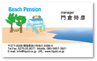 ビーチペンションのデザイン名刺です。ビーチに建つペンション、サーフボード、ハンモックを描いてみました。サーフィン、ビーチペンション関係のお仕事の方いかがでしょうか。