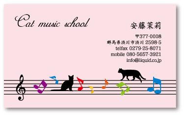 音楽教室名刺デザイン。五線の上に2匹の猫を配置しました。音楽教室の方いかがでしょうか。 このデザインはリクエストにお応えしてお作りしました。 フォント、記載事項、色、レイアウトはご希望に添ってカスタマイズできます。御注文の際にお申し付け下さい。 おすすめ名刺用紙:コンケラーゴールドダスト(とにかく美しいです・大人気) 他の音楽教室名刺もご覧下さい。音楽教室名刺コーナーへGO!!