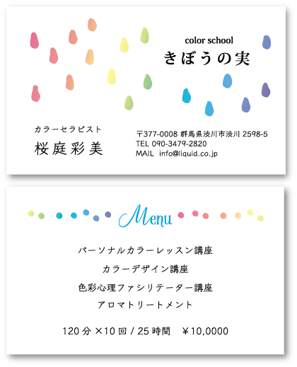 虹色の雨のような種が色についての学びを暗示させるカラースクール名刺デザイン