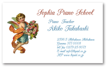 天使名刺。大きな花束を持った天使のクラシカルな美しいイラストをモチーフ。クラシカルな英文フォントとクラシカルな色使いでイラストにあった雰囲気を醸し出して。グリーティングカードのようなデザイン名刺。