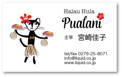 ウリウリを手に踊るねこが愛らしいフラ名刺デザインです。