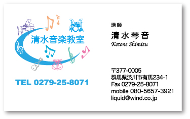 音楽教室名刺です。教室の名前をロゴ風にアレンジ、いろいろな楽器、音符のイラストを散りばめました。音楽教室の先生、いかがでしょうか。 色、フォント、記載事項はご希望に添ってカスタマイズできます。御注文の際に、お申し付け下さい。 おすすめ名刺用紙:コンケラーゴールドダスト(とにかく美しいです・大人気) 他の音楽教室名刺もご覧下さい。音楽教室名刺コーナーへGO!!