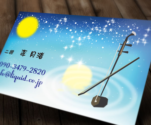 二胡の音に誘われて幻想的な世界に引き込まれそうな二胡名刺デザインです。