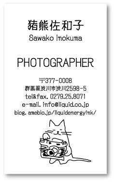 フォトグラファー名刺。ライカを抱えるゆるい猫のイラストをモチーフ。印象的なデザインだと思います。フォトグラファーの方、いかがでしょうか。このデザインはリクエストにお応えしてお作りしました。 色、フォント、記載事項、レイアウトはご希望に添ってカスタマイズできます。