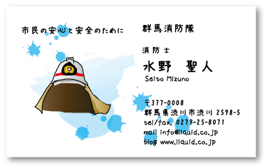 消防名刺。消防士のヘルメットイラストをモチーフ。周りに水をイメージさせる青の跳ねを散らして。危険に立ち向かう消防士の勇気の象徴として。キャッチコピーは「市民の安心と安全のために」。消防士の方、消防関係の方、いかがでしょうか。
