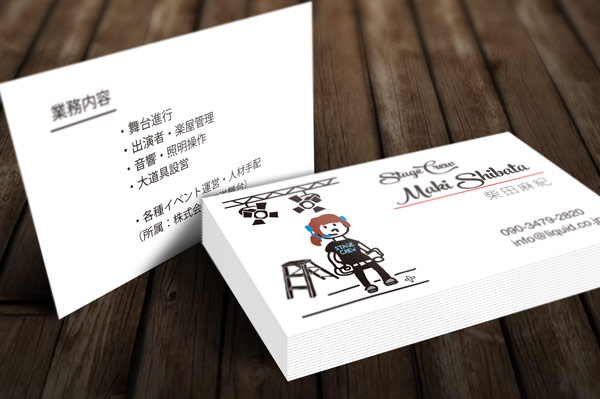 女性スタッフがインカムをつけて、バミテ、進行表を手に舞台で頑張っている姿を絵にした名刺デザインは可愛らしく、かっこ良くクライアントさんにも好印象をもたれそう