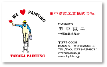 塗装業名刺です。脚立に乗った職人さんが壁を塗っているイメージです。壁にはWE LOVE PAININGTとかかれています。(この文字はご自由に変えて結構です。)イラストの下には会社名を英語でロゴ調に入れてあります。塗装業の方、いかがでしょうか。 色、フォント、記載事項はご希望に従ってカスタマイズできます。御注文の際にお申し付け下さい。 推薦用紙:コンケラーゴールドダスト(豪華、お洒落、綺麗) 他の塗装業名刺もご覧下さい。塗装業名刺コーナーへGO!!