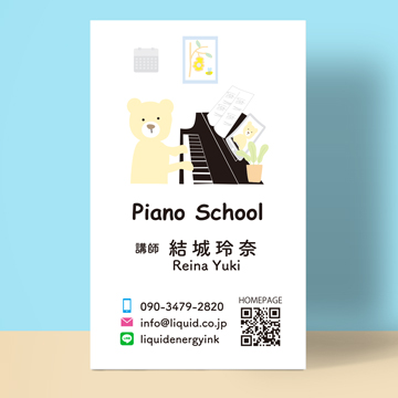 ピアノ教室のポストカードサイズチラシ。虹や、音符、女の子とピアノのかわいらしいイラストで。誰からも愛されるポストカードサイズチラシは集客の力になります。QRコードをつけて、スマホから直接、ホームページ、SNSへ誘導。生徒募集に。